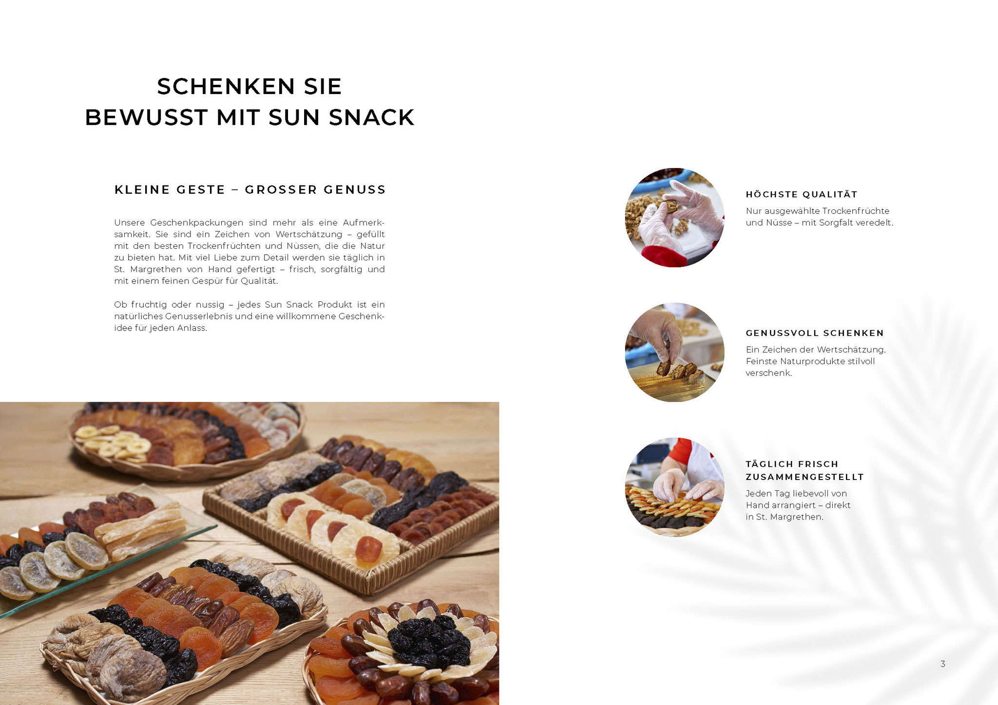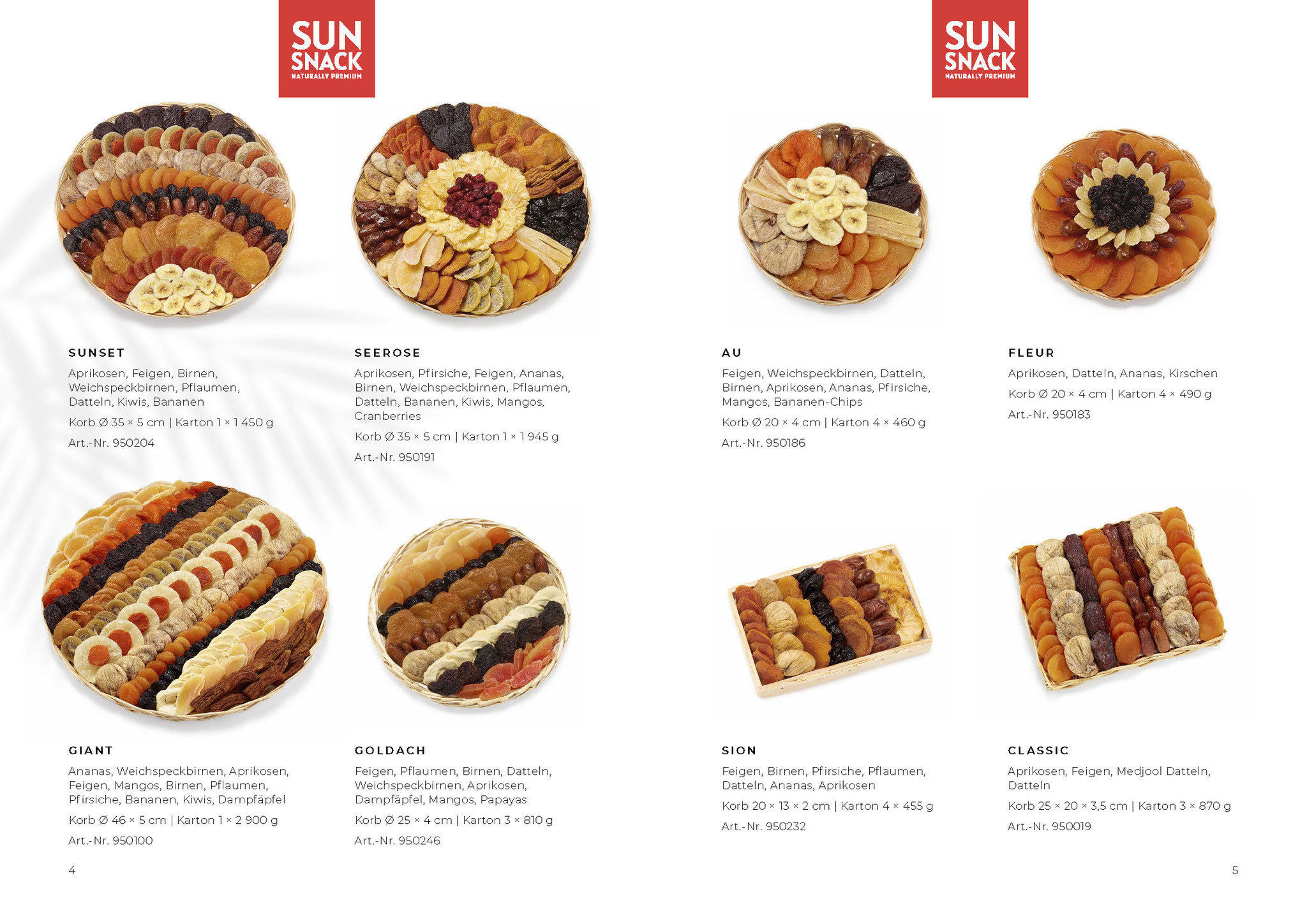 Kreativität und flinke Hände sind bei unseren einzigartig von Hand gestalteten und täglich frisch produzierten Arrangements gefragt. Eine Sun-Snack Geschenkpackung ist ein gesundes und bekömmliches Geschenk, das zu jeder Jahreszeit Freude bereitet.