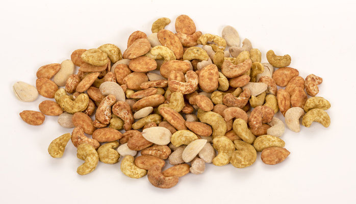 Cashews, Mandeln, Salz, Paprika, Knoblauchpulver, Cayennepfeffer, Curry (Kurkuma, Koreander, GELBSENF, Zwiebeln, Kreuzkümmel, Knoblauch, Bockshornklee, Lorbeerblätter, Paprika, Muskatnuss, Pfeffer, Ingwer), Kartoffelstärke