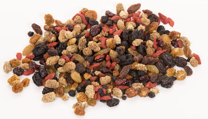 Sultaninen (Smyrna, Golden, Flames, Thompson), Kap-Stachelbeeren, Maulbeeren, Cranberries, Aronia, Heidelbeeren, Goji Beeren, Zucker, Sonnenblumenöl, Schwefeldioxid